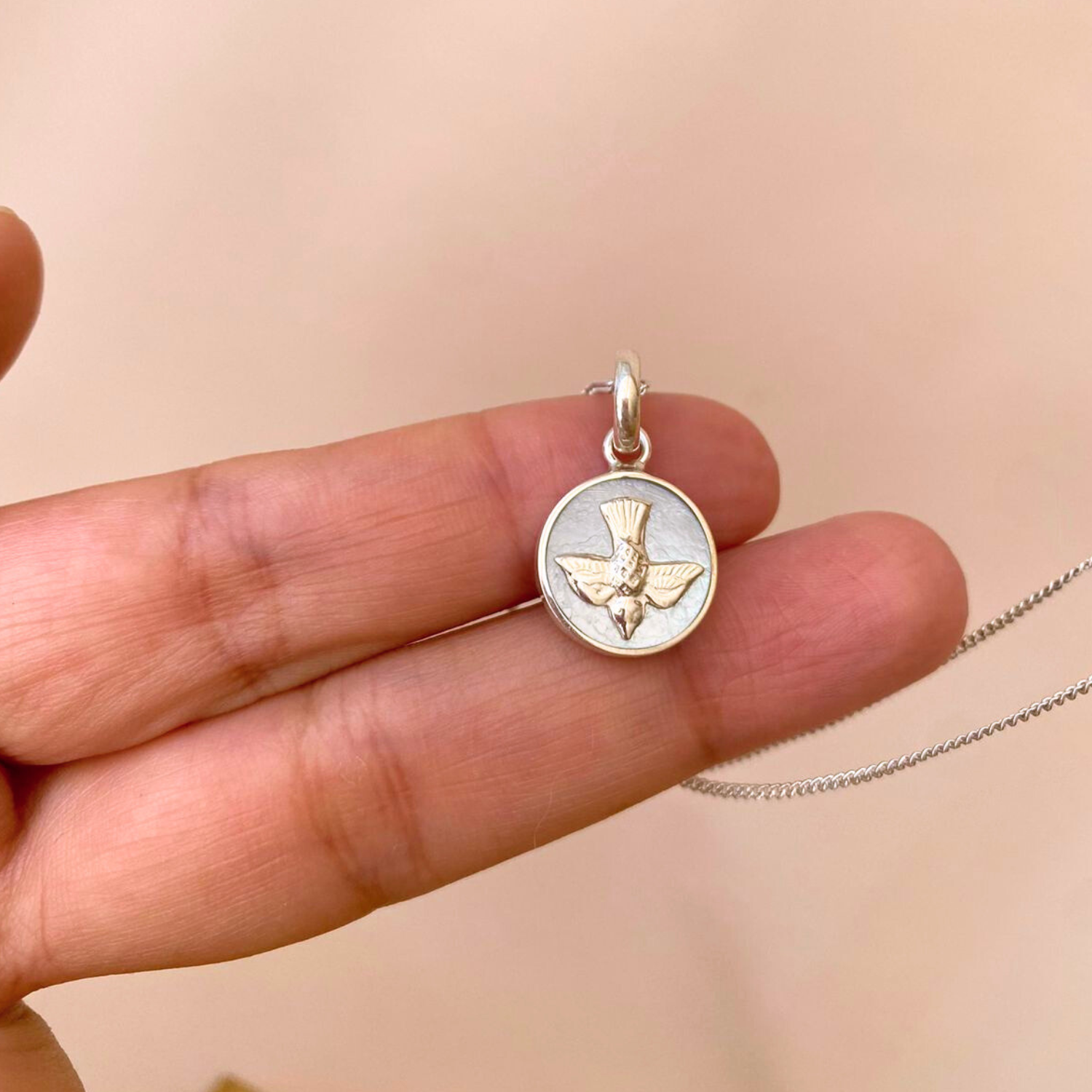 Este hermoso dije esta hecho con un encajonado de plata 950, la base de nacar y la imagen en lamina en plata 950